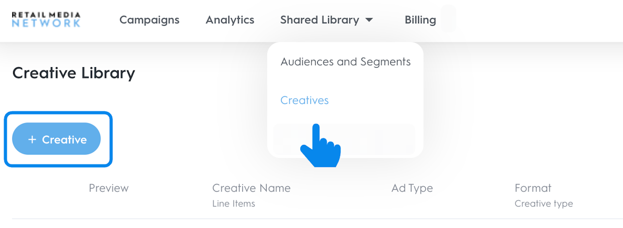 Navigate to the Shared Library tab on your dashboard and select Creatives. You will see the Creative Library page.