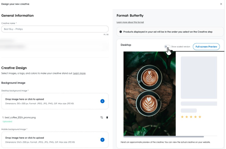 This toggle lets you view your creative as it would appear at its smallest supported size. This helps spot any layout issues early.Native Size Support