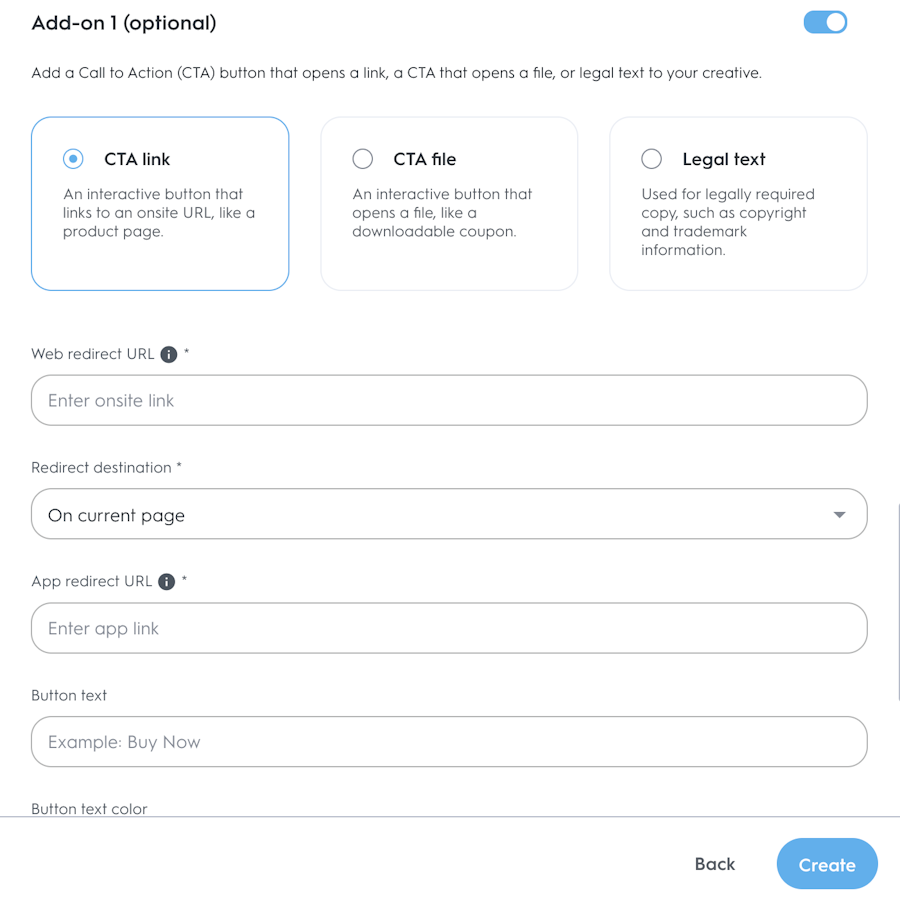 Add-ons: After filling out the mandatory fields, you can add optional fields as well to your ad like a Call-to-Action (CTA) link, CTA file, or legal text that may be required for your product.