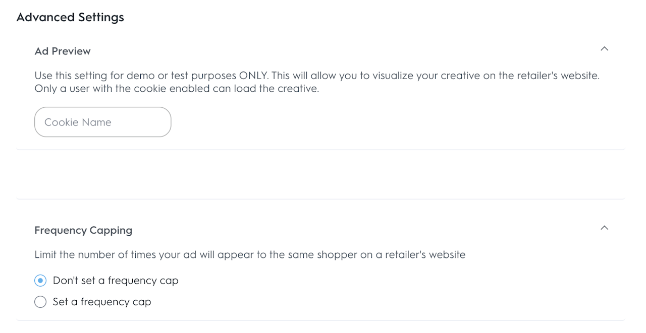 Frequency Capping - Limit the number of times your ad will appear to the same shopper on a retailer's website. To set it: