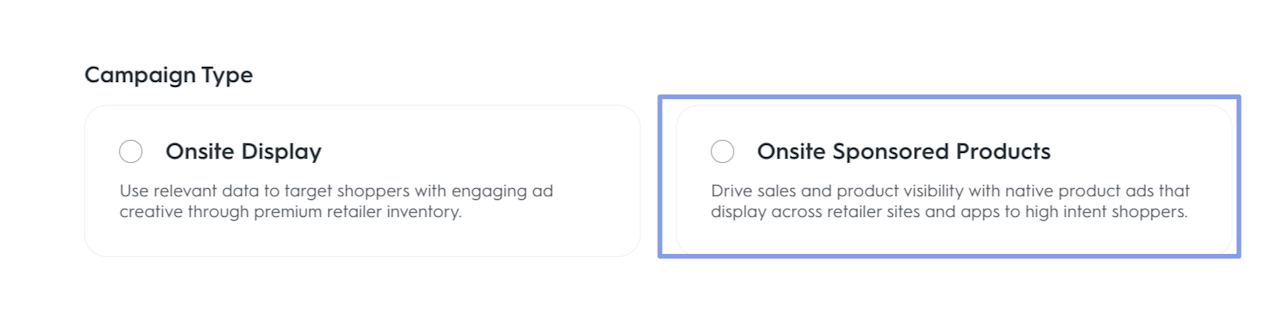 On the Create Campaign page, choose the Campaign Type to be Onsite Sponsored Products.
