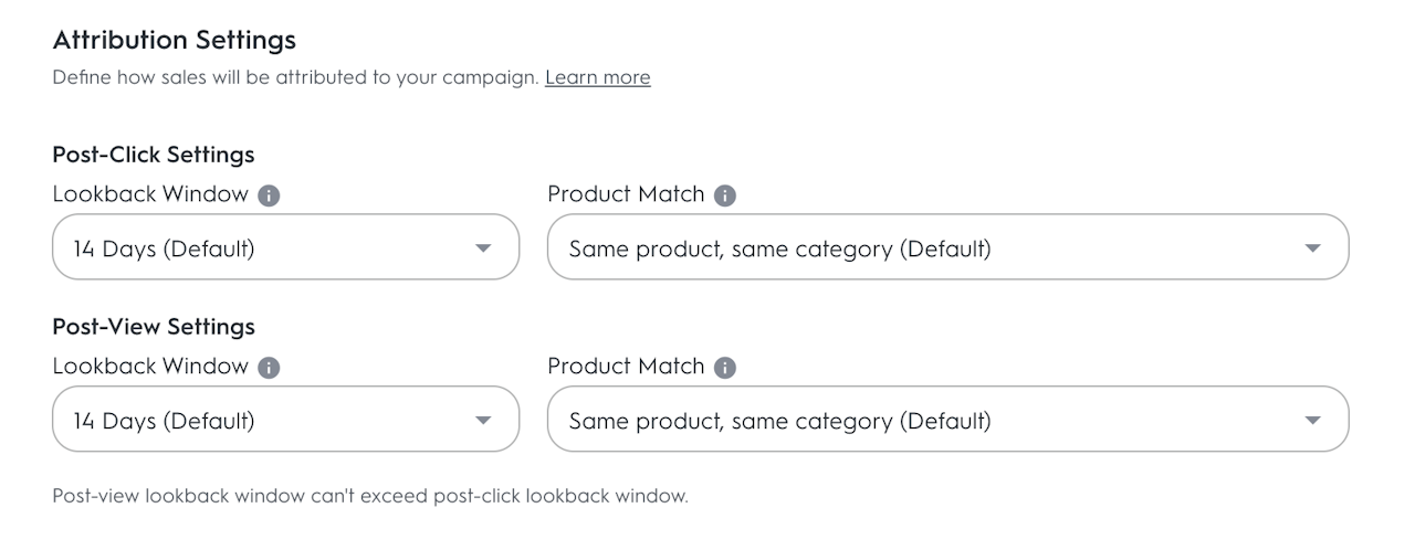 By choosing an attribution model, you control how Return on Ad Spend (ROAS) is calculated and gain insights into how your ads influence sales.Lookback Window (How long after seeing an ad a purchase is counted)