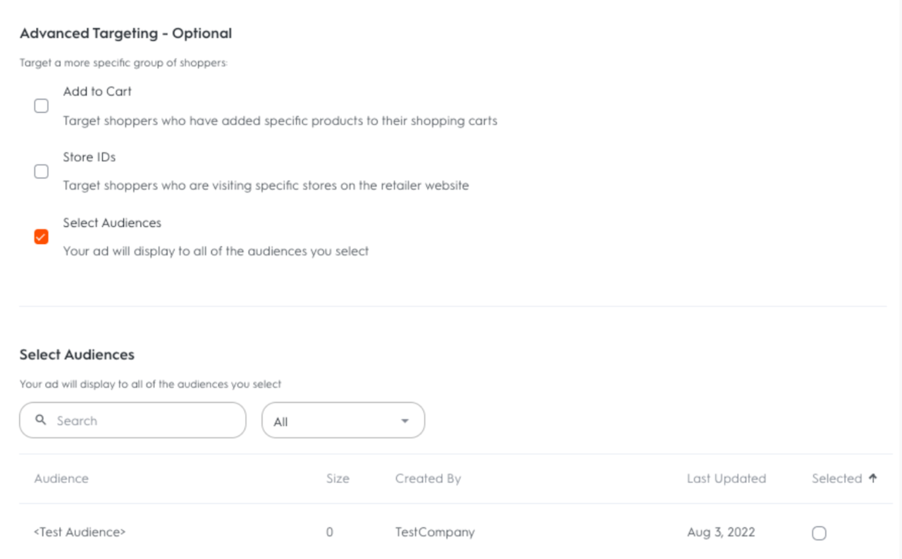 Use the dropdown to filter between Audience Builder segments and Customer Lists shared by us.