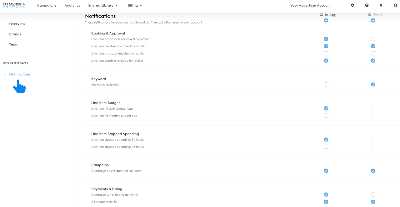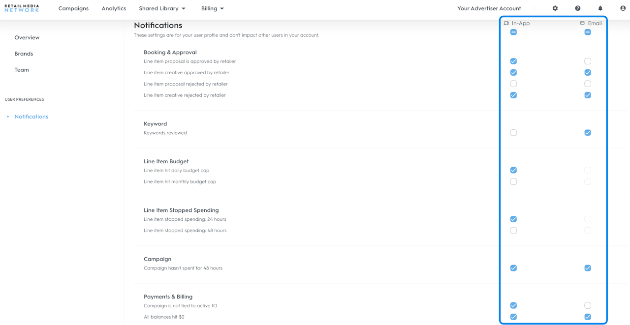 Next to each notification, choose whether to receive notifications in-app (UI) and/or by email. By default, in-app notifications are ON, and email notifications are OFF.