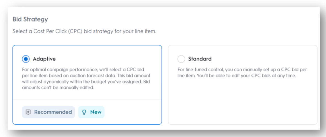 The goal of Adaptive CPC is to help each line item achieve strong performance outcomes while spending its full budget efficiently, avoiding premature cap-outs and maintaining visibility during peak traffic periods.