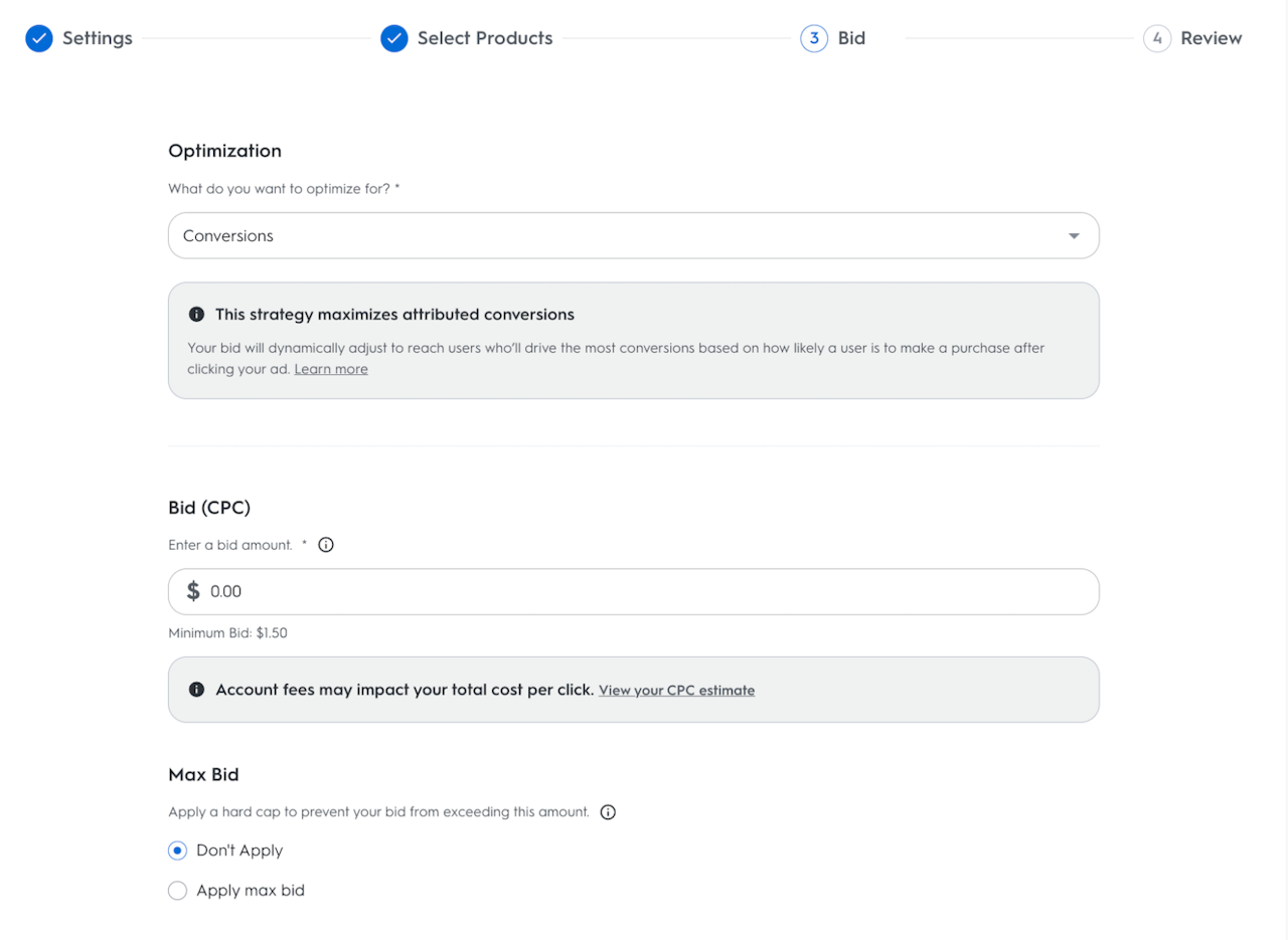 Like our Standard optimization models, it dynamically adjust bids based on the likelihood that showing your ad will lead to a shopper taking a desired action, as determined by your choice of base optimization model, either Clicks, Conversions, or Revenue.