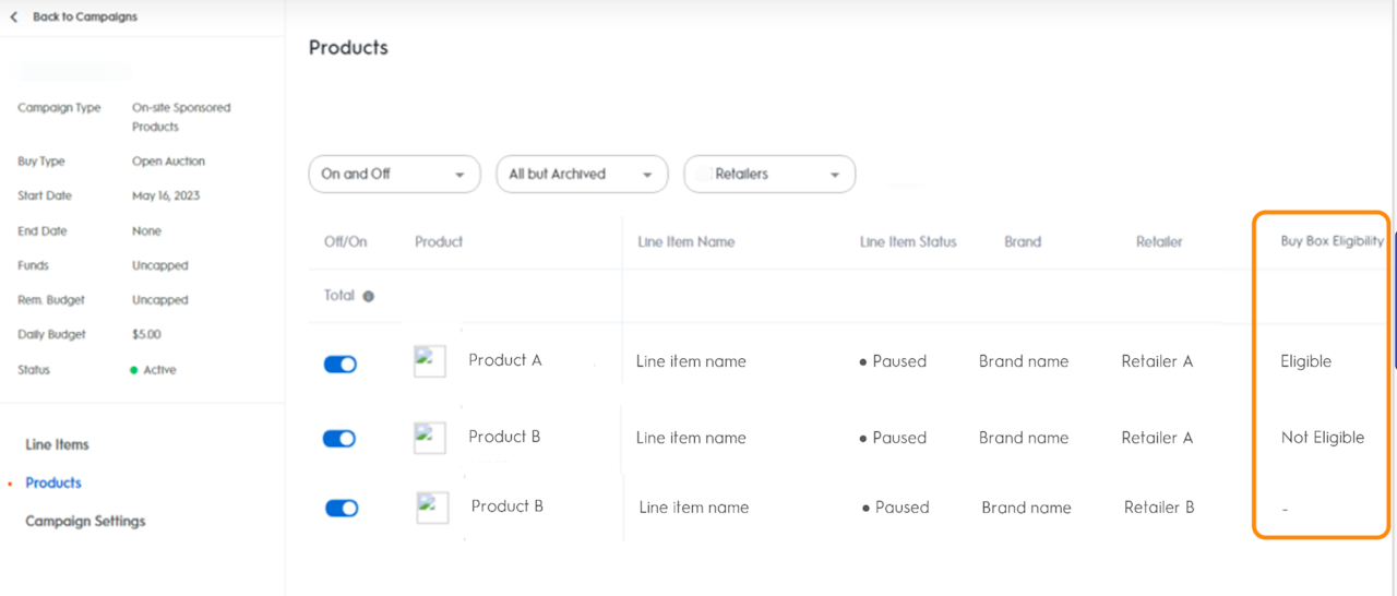 For Sponsored Products campaigns, you can see if your product is eligible to show in ads based on its BuyBox status.